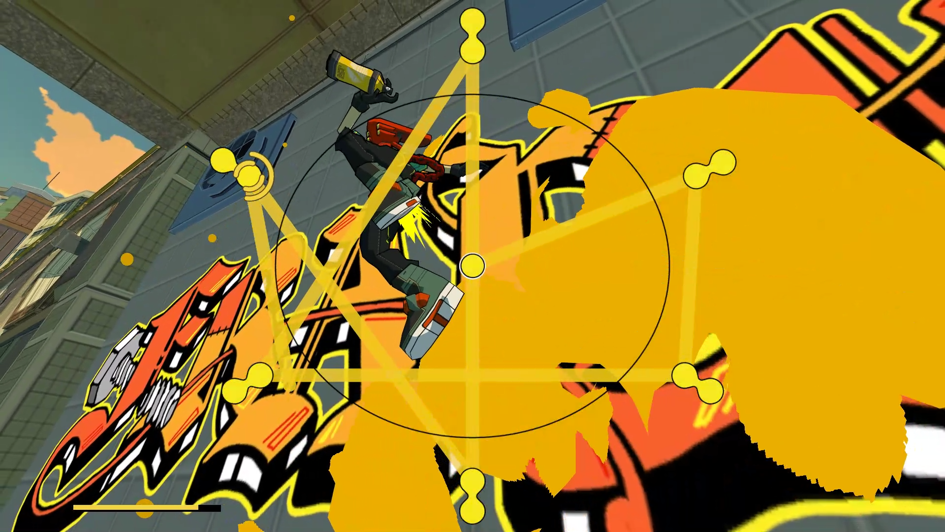 Tagging, the most important part of Bomb Rush Cyberfunk, combines the ease and portability of JSRF and the interactivity of JSR. To tag, the player needs to move the left analog stick in a certain pattern in order to complete a tag. It's a lot of moving the analog stick in a frantic motion, but each grafitti tag has a unique pattern with more needing to be discovered through completing challenges. This can also be done during a combo and can even extend the multiplier by giving the player that much-needed bonus score.